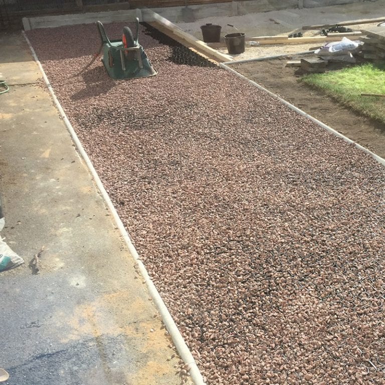 Finally, all that was left to do was for Andrew to fill the grid with his newly purchased red gravel and the project is completed. Around 8kg of gravel is required to fill each individual panel so you can estimate how much gravel is required to complete the full area.