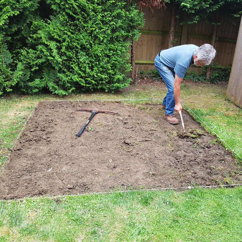 Once a dry day arrived, Dave decided to get his base out and get it installed. He started by measuring and marking out the area of the base using string before digging up all of the turf and soil inside the string lines which you can see from the photo above.