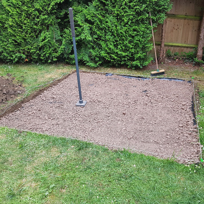 Dave then began filling the full area with gravel, around 8kg of gravel is needed to fill each panel so you can estimate how much gravel you will need for your base. This was again not hard but was a little more time consuming.