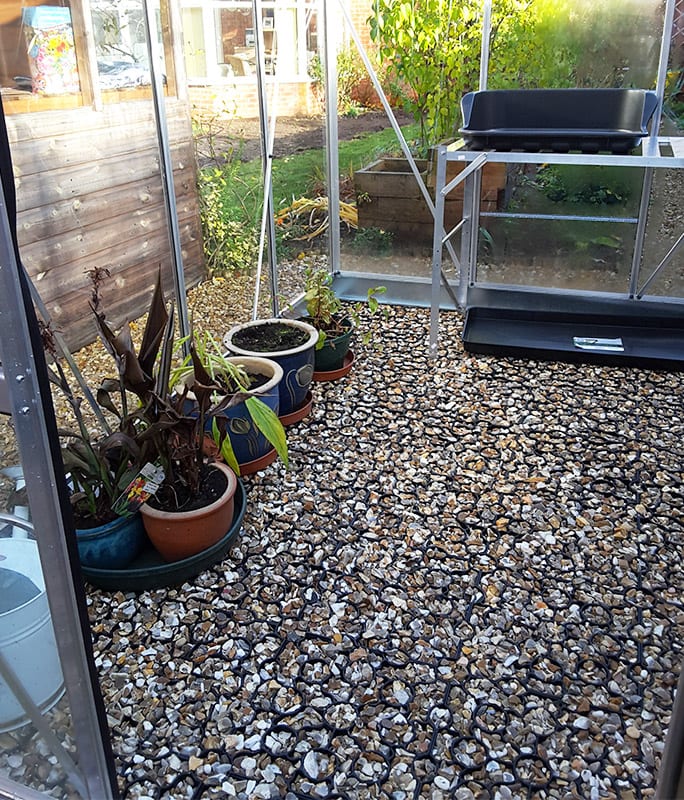 Next, Rosie filled the base and surrounding area with angular gravel. We estimate that around 8kgof gravel is needed to fill each panel so you can roughly work out how much is required.