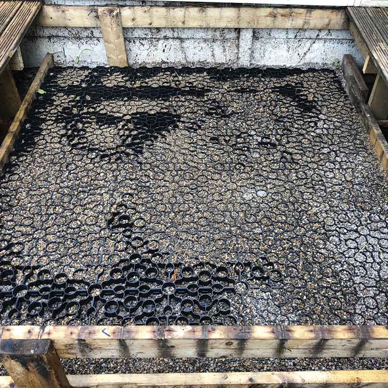 Once the entire base was installed, Steve began filling the area with 10mm gravel. Our estimate is that around 8kg of gravel is required to fill each hot tub base panel, so for Steve to fill his full base, around 512kg of gravel would be needed.