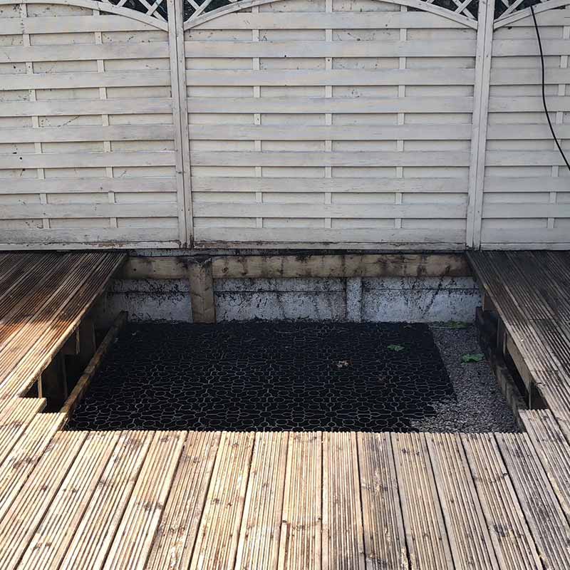 Steve knew that the existing floor under the decking would not be suitable to support and prolong the life of his hot tub, thus began his search for a strong base that would reduce the possibility of rot occurring to his spa whilst it is under the decking. Steve researched online for a suitable product to meet his needs and after a little browsing came across our strong, permeable and easy to lay plastic hot tub base.