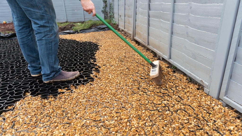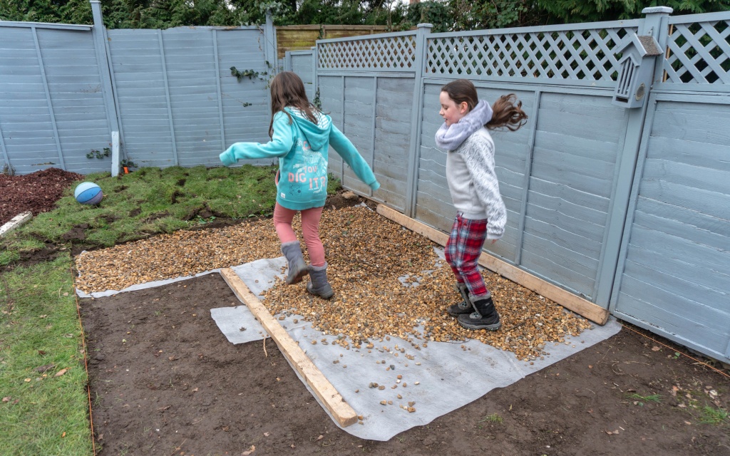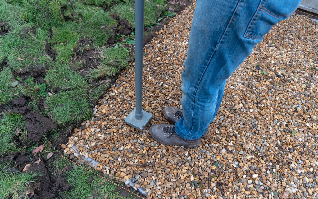 Next, you need to lay down a bedding layer of around 30mm in depth using 5-20mm diameter angular gravel or crushed aggregate. You need to compact this down well to ensure that the surface is as hard and level as possible. If required, you can level the area using sharp sand. (Photos 7, 8 & 9)