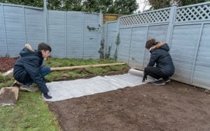 Now you need to roll out your woven geotextile membrane sheet and secure it into the ground below. This can be done by using pins or something heavy that can be moved when you move onto the next step. The membrane is used to prevent weeds from growing up and through the shed base whilst being permeable to allow water and nutrients to drain away into the ground below. (Photo 6)