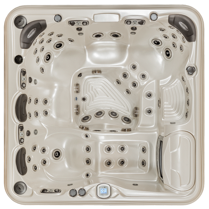 Fourth we have the Dove Canyon Hot Tub from Artesian Spas. The 6 seater spa with dual rotating foot jets and a calf massage making it unique to relieve the stress a day can have on your legs. With a total of 67 jets wherever you sit in this hot tub you will be receiving a great massage. Along with the jets, every Platinum Elite spa comes standard with an enhancing waterfall water feature to add a little more luxury. The control panel is a stylish and technologically advanced incorporating wifi, multilingual settings and a touch screen on selected models.