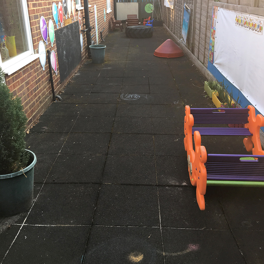 With all of the black play tiles on a pallet at the nursery, Simon could arrive and begin work immediately. As you can see from the photos, the area was a path down the side of the building with a brick wall on one side and a wooden fence on the other. Prior to installing the mats, the floor was concrete so was not suitable for children to play on.